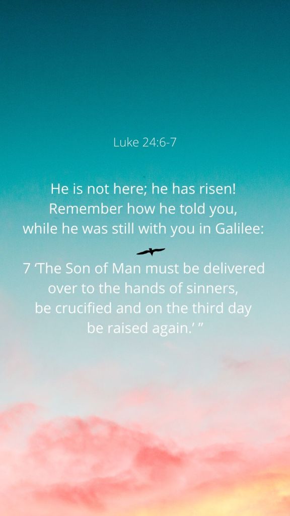 He is not here; he has risen! Remember how he told you, while he was still with you in Galilee: ‘The Son of Man must be delivered over to the hands of sinners, be crucified and on the third day be raised again.’ ”